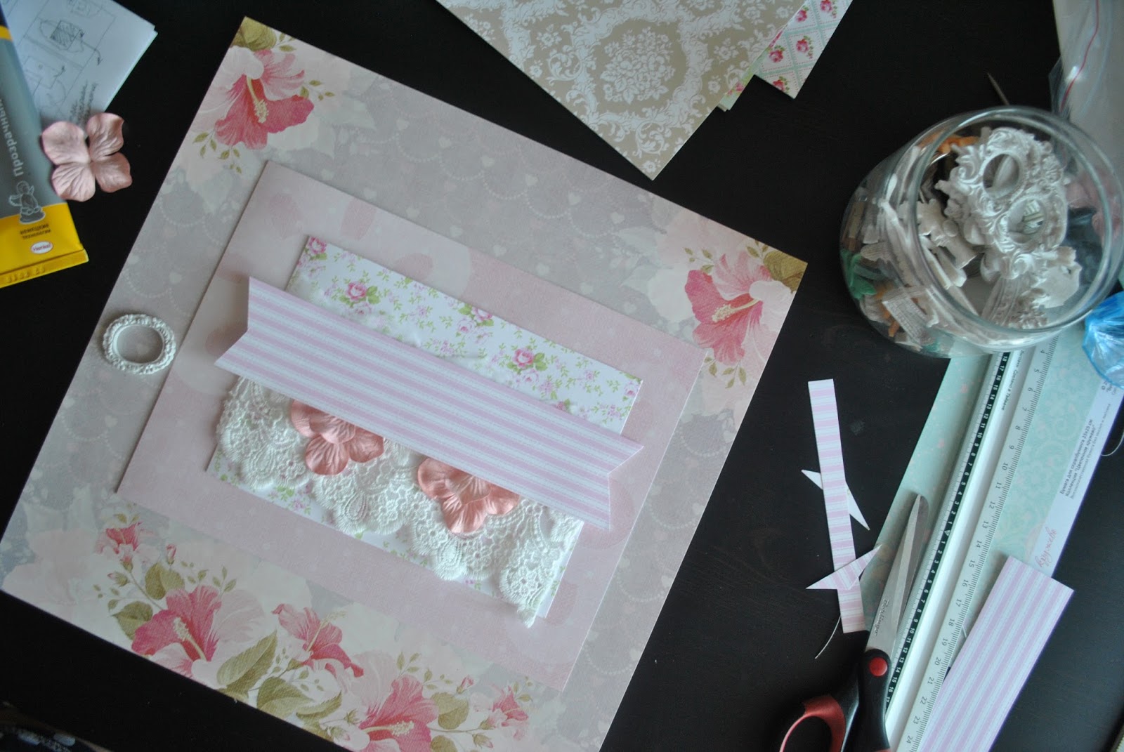 Откладываю один из листочков в сторону и начинаю оформлять первый разворот.